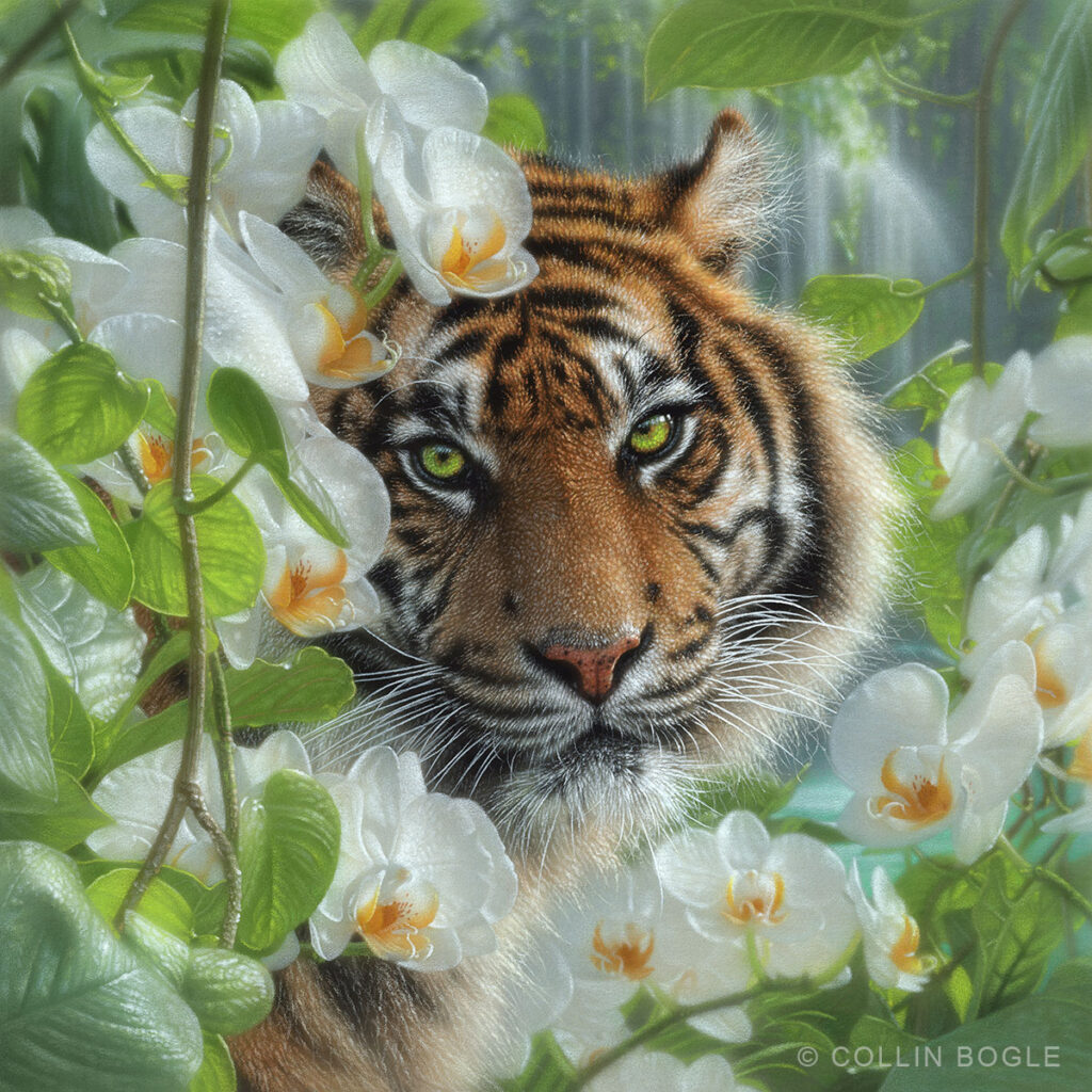 Born in 1973 in the picturesque Pacific Northwest region of the United States, Bogle’s artistic journey began at a young age, inspired by the rich natural beauty that surrounded him. The son of a renowned American artist, Collin learned the concepts of technique, composition and design from his father, Lee Bogle, later refining his skills and setting out on his own artistic path. His remarkable ability to capture detail and to master the use of light in natural settings became hallmarks of his work. “Light plays a major role in my work,” states the artist. “An abundance of light and shadows creates a playground for me, and allows a painting to take on a life of its own.”Bogle’s artistic versatility knows no bounds, as he seamlessly transitions between mediums such as watercolor, colored pencil, and pastel. His ability to breathe life into his subjects, whether it be a majestic wolf in a snow-covered forest or a delicate flower in bloom, has earned him a devoted following of collectors and admirers. Today, Bogle continues to create breathtaking works of art from his home studio in the Seattle area, drawing inspiration from the stunning landscapes and diverse wildlife that surround him. With each brushstroke, he invites viewers to experience the wonder and magic of the natural world through his eyes, leaving a lasting legacy of beauty and inspiration for generations to come.
